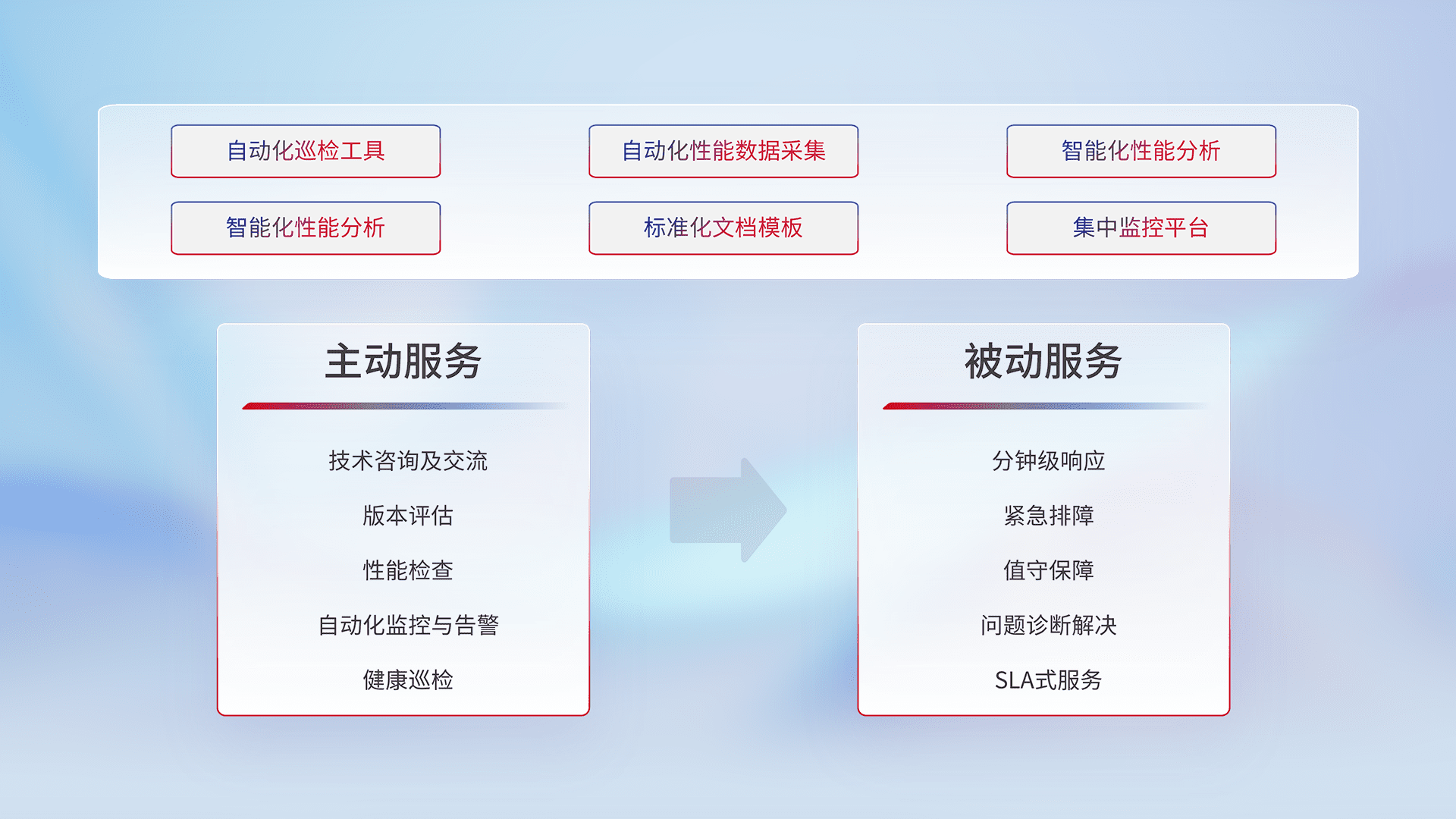 智能化工具和标准化文档,,,保障服务质量,,提供主动服务(包含技术咨询、、、版本评估、、性能检查、、、、自动化监控与告警、、健康巡检)和被动服务包含(分钟级响应、、、、紧急排障、、、、值守保障、、问题诊断解决、、、、SLA服务)。。
