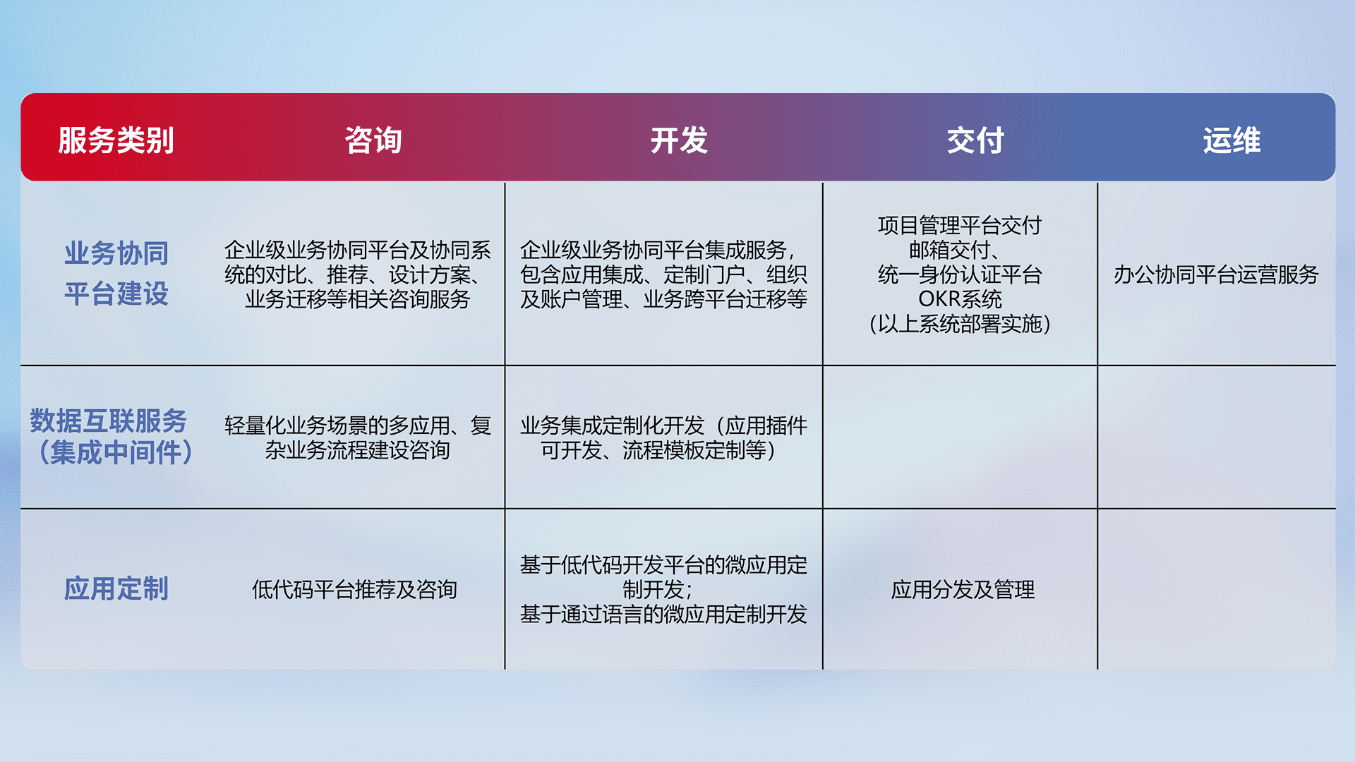 针对钉钉、、企微、、、IDaas等平台级产品提供产品的规划、、、、方案、、交付、、定制化开发等服务,,,,实现如统一协同办公、、、、智能客户服务、、、混合会议管理、、、智能数据查询、、等业务场景,,实现数字化转型。。。。